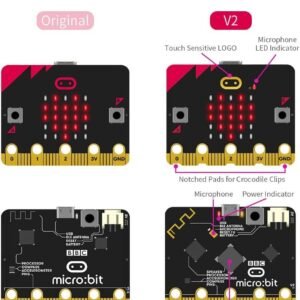 • Micro:bit V2 offers 5×5 red LED matrix with separate control for each LED, and two programmable user buttons that can be used to control games or pause/skip songs on a playlist.